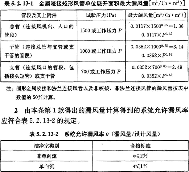 5.2.13 咬接和法蘭連接的金屬風管,應在膠封縫隙以后和絕熱之前,按附錄A的方法進行分段漏風檢測或按現行國家標準《通風與空調工程施工質量驗收規范》GB 50243的方法進行干管和主管系統的漏風檢測。1~5級潔凈度環境的風管應全部進行漏風檢測,6~9級潔凈度環境的風管應對30%的風管并不少于1個系統進行漏風檢測。檢測結果應同時符合下列兩項嚴密性指標: