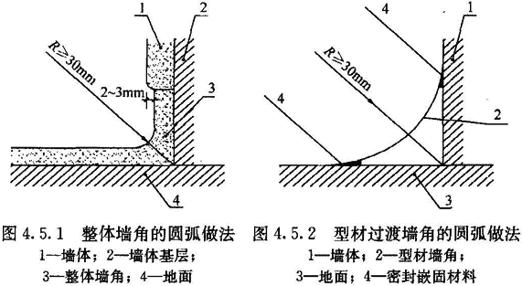 4.5.1 地面與墻面的夾角應(yīng)為曲率半徑只不小于30mm的圓角。當(dāng)用柔性材料粘貼地面時(shí),在墻面上應(yīng)延伸至地面以上形成圓角并與墻面平齊,或略縮進(jìn)2mm~3mm,突出的墻面應(yīng)圓滑過(guò)渡(圖4.5.1)。需經(jīng)常沖刷的地面,地面材料在墻面上延伸高度應(yīng)大于150mm。